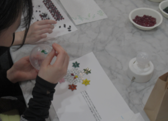 色とりどりのスモークガラスやビーズなどを各々のデザインに張り付けていく、