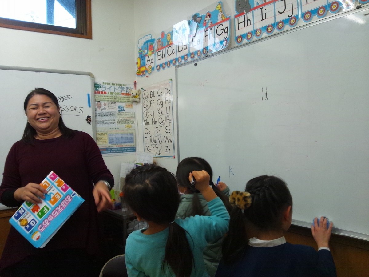 Aクラスは先週習ったshapeの復習から入りました。Circle, triangle, square, star, diamond, rectangle。発音を復習した後には、2チームに分かれて、Ruth先生が読み上げた形を、誰が早く描けるか競争をしました。