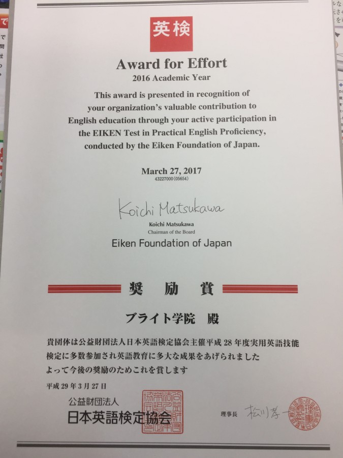 ブライト学院も毎年教室から多くの人が英検を受け、合格しているため、奨励賞をいただきました。
